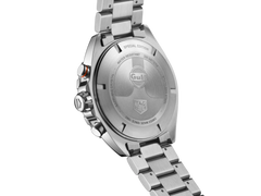 タグ・ホイヤーとガルフが紡ぎ続ける伝説的なパートナーシップを思わせる、大胆でエネルギッシュなクロノグラフです。モーターレーシングにインスピレーションを得、ガルフを象徴するブルーとオレンジのカラーを纏ったケース径43mmのウォッチが、スタイリッシュにスピードを上げます。
