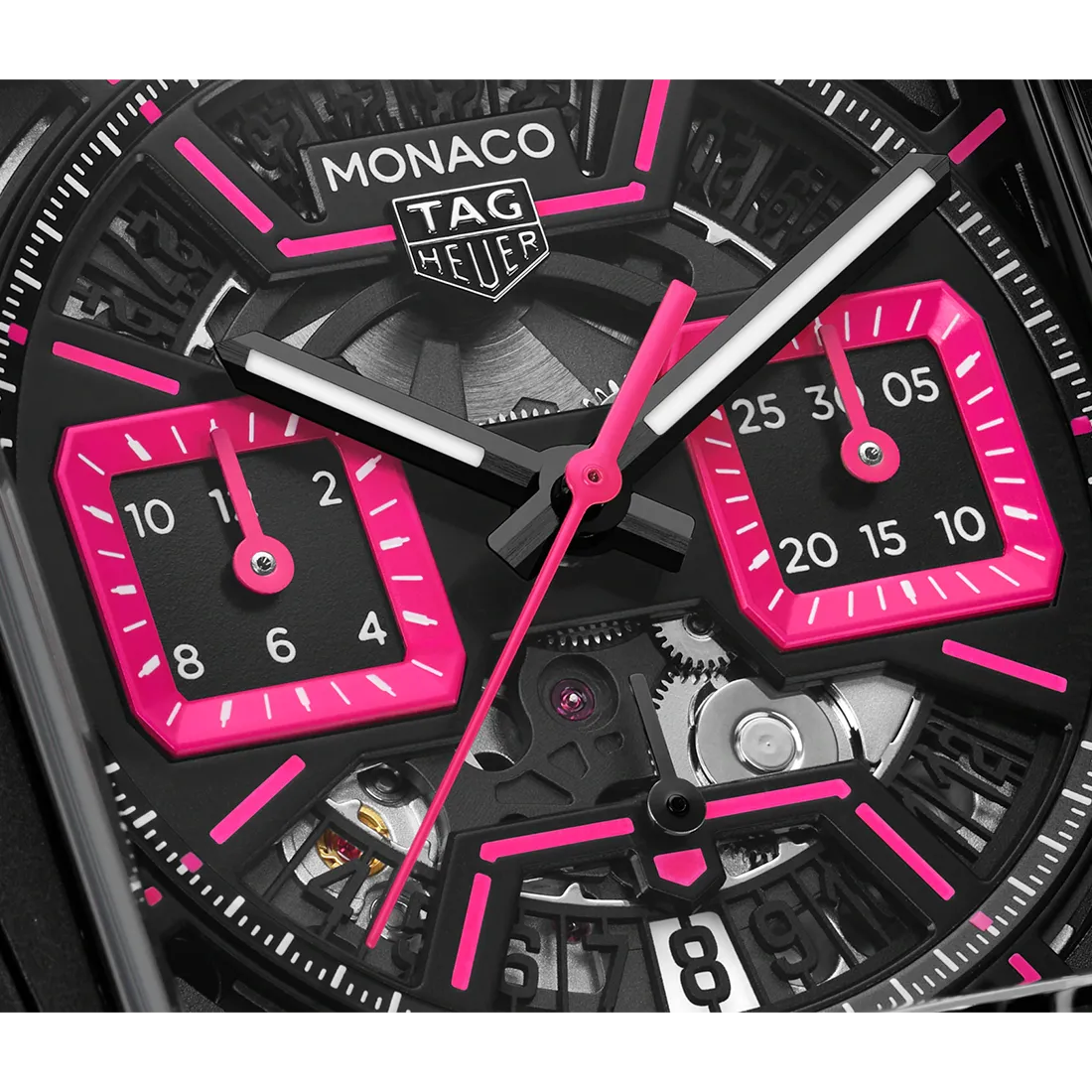 アヴァンギャルドなタグ・ホイヤー モナコ クロノグラフがいざなう、大胆な革新の世界。クラシックなウォッチにコンテンポラリーなひねりを加えたこのタイムピースは、鮮やかなピンクとクールなブラックを合わせたスケルトンダイヤルを備え、現代の先駆者たちがもつ大胆なスピリットを体現しています。