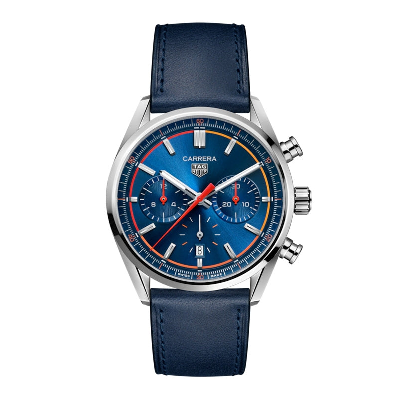 モダンでダイナミックなデザインに作られたこのタグ・ホイヤー カレラは、モーターレーシングの精神を全面に押し出しています。目を引くオレンジのグラデーションリングと鮮やかなオレンジのタッチを添えた、深みのあるブルーダイヤルに、ブルーのカーフスキンストラップが美しくマッチ。勝利を見据えたデザインです。