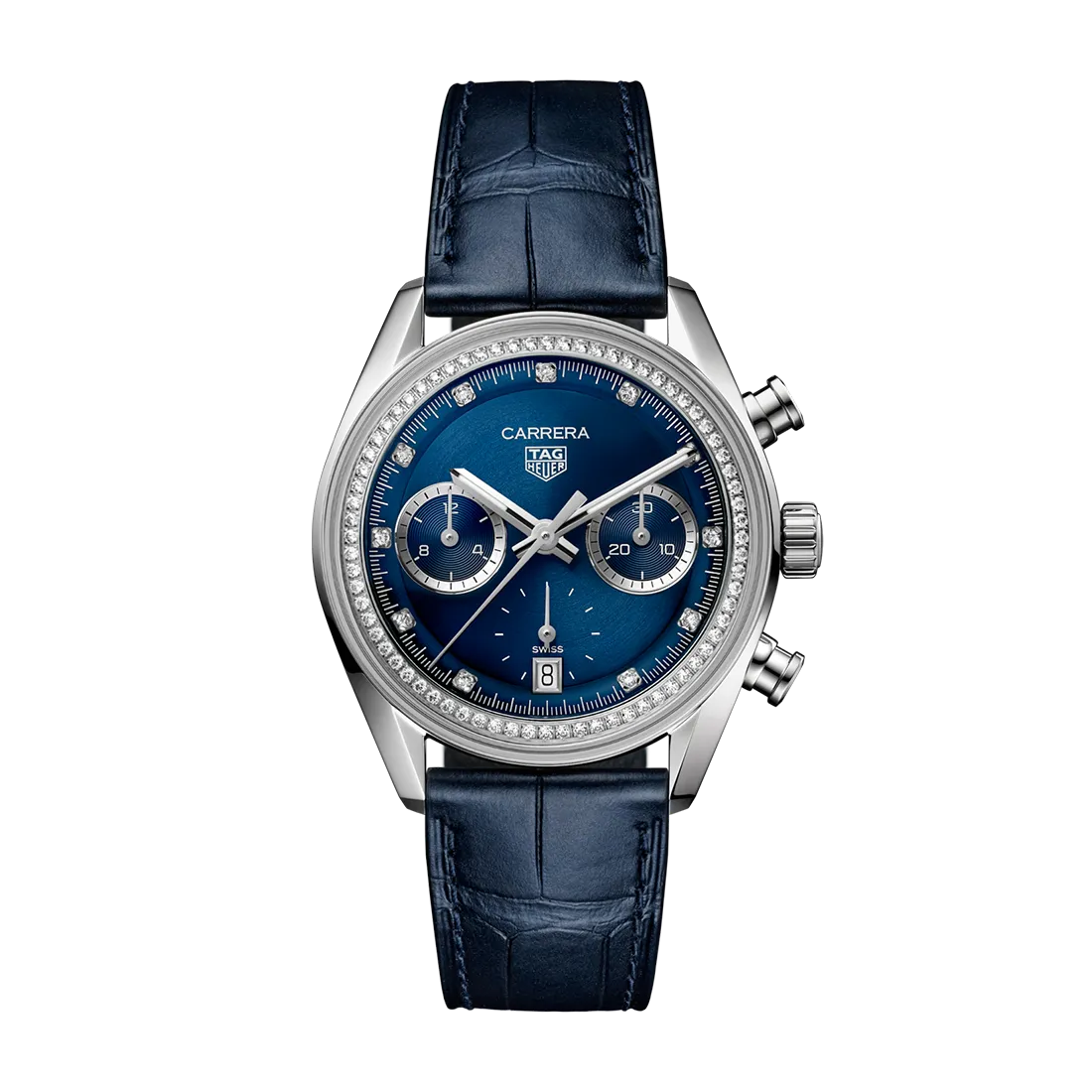スポーティなスタイルに、シグネチャーブルーにセットしたダイヤモンドが煌めく、ケース径39mmのタグ・ホイヤー カレラ クロノグラフ。ブランドの革新的な「グラスボックス」を採用した、モダンな女性にふさわしい洗練されたデザインです。