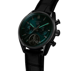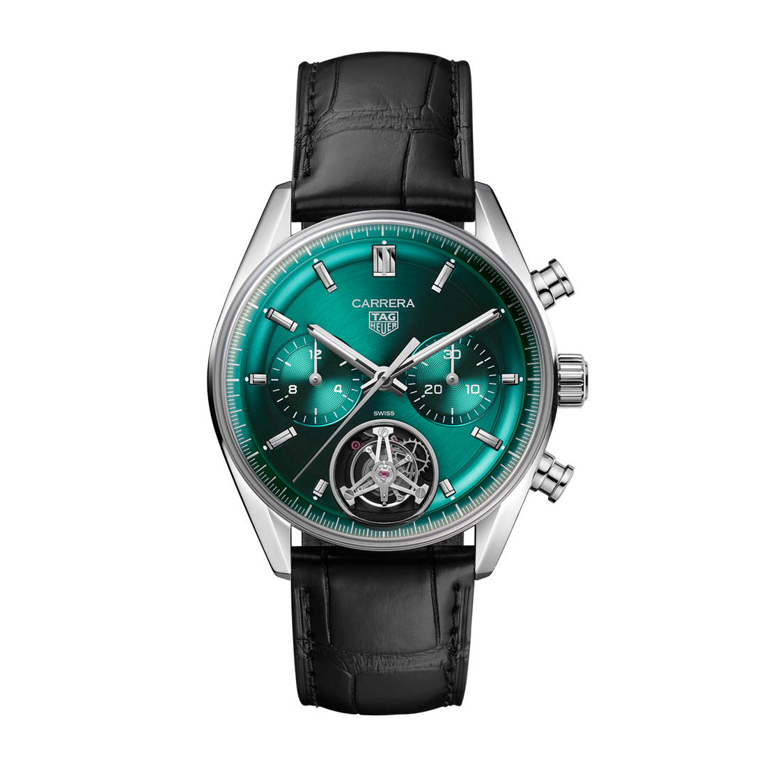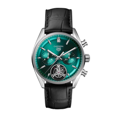 ケース径42mmの優れたデザインが際立つ、タグ・ホイヤー クロノグラフ トゥールビヨン 。印象的なモノクロームのティールグリーンのダイヤルには、高精度なタイムキーピングの本質が集約されています。ブラックのアリゲーターストラップが合わせられ、スタイリッシュなスピード感を演出します。
