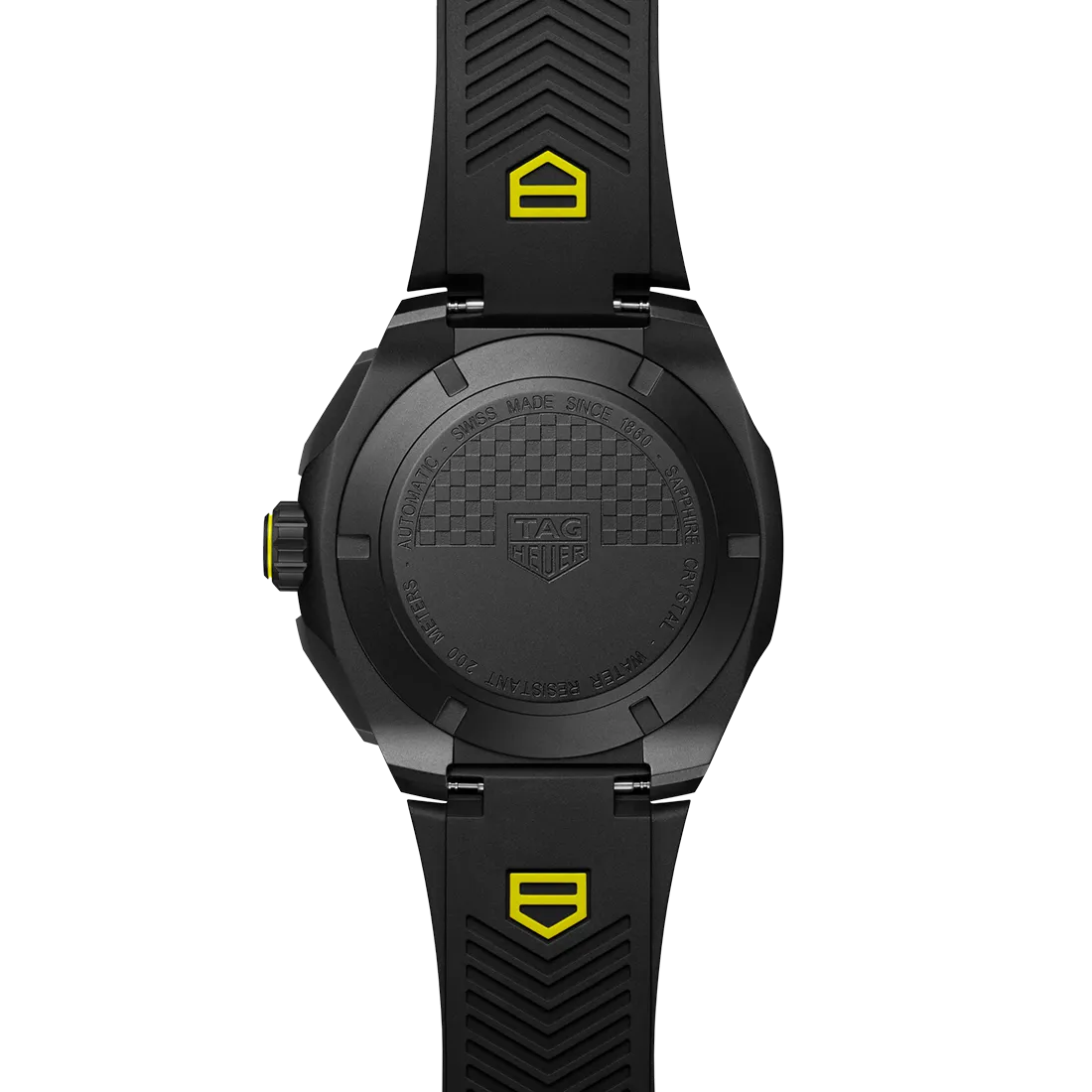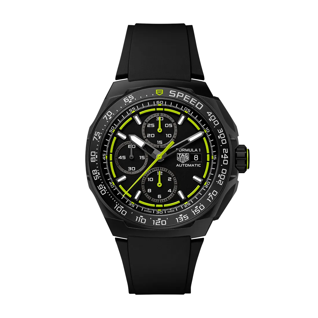 ケース径44mmの新しい大胆なカラースキームの、タグ・ホイヤー フォーミュラ1 クロノグラフ。ライムグリーンがアクセントのダイナミックなデザインが、精度とスタイルにこだわるモダンレーサーにふさわしい風格を漂わせます。