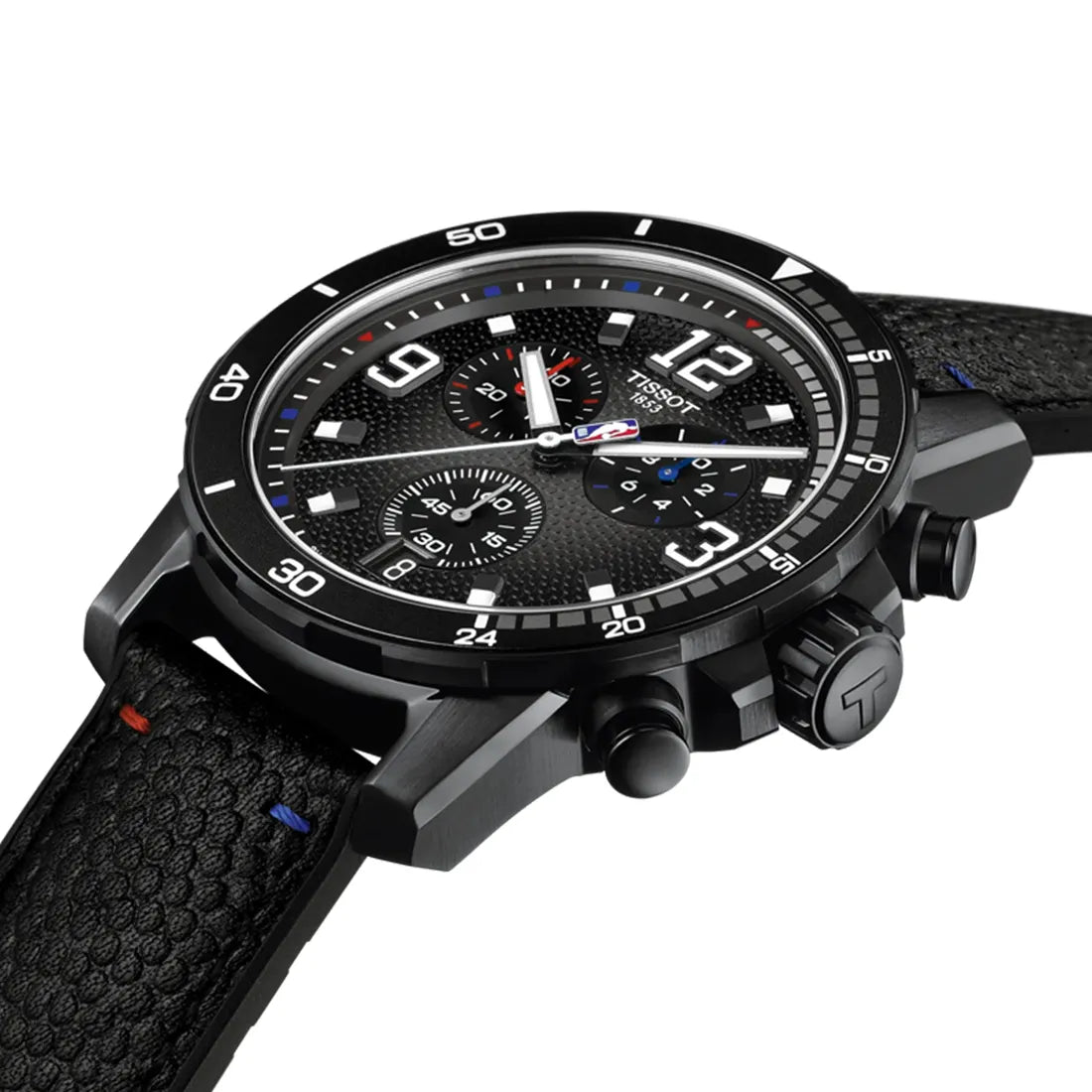 印象的な45mmのブラックPVD加工ステンレススチール製ケースには、NBAのショットクロックをモチーフにした24秒ルールのベゼルが配され、リーグをイメージしたカラーがアクセントになっています。