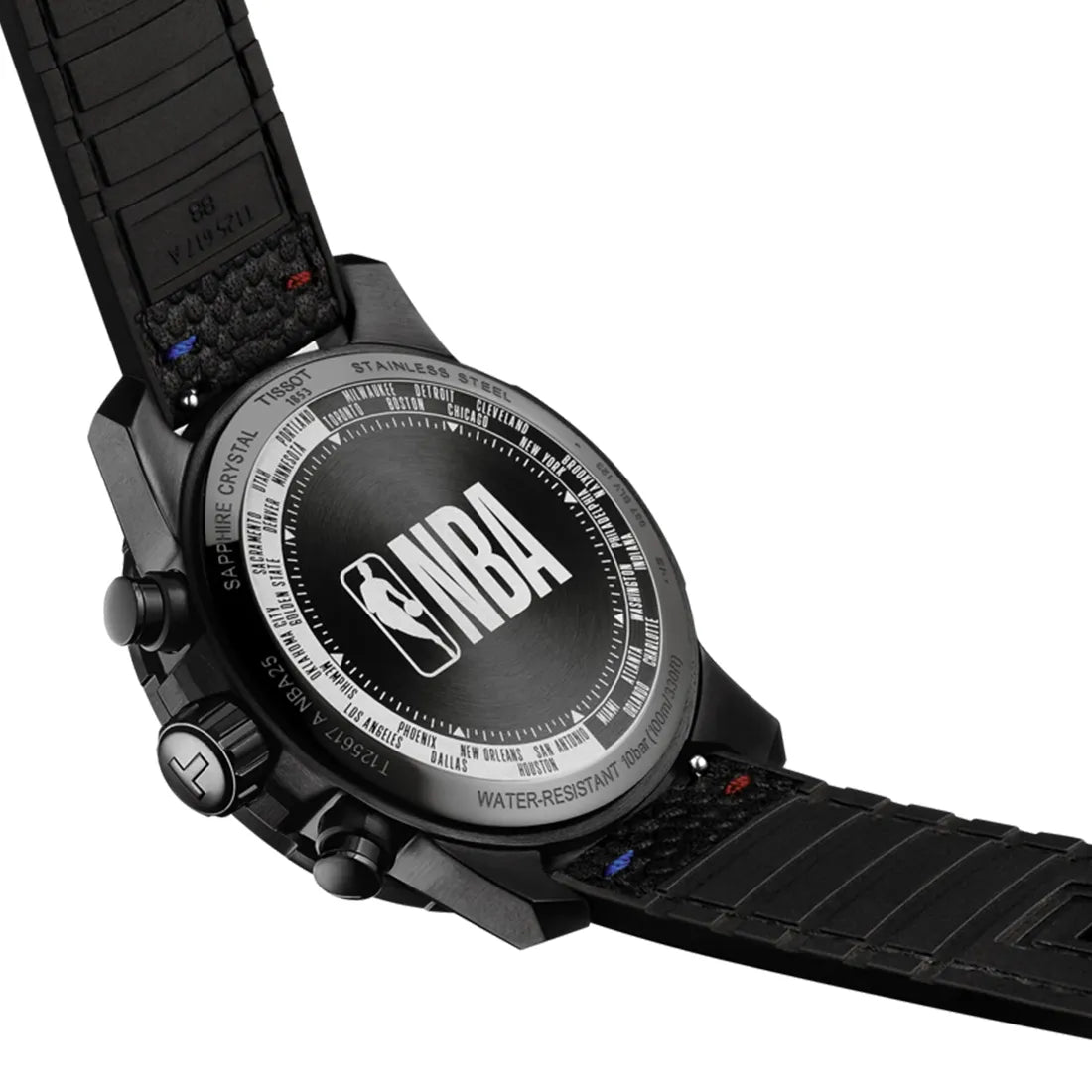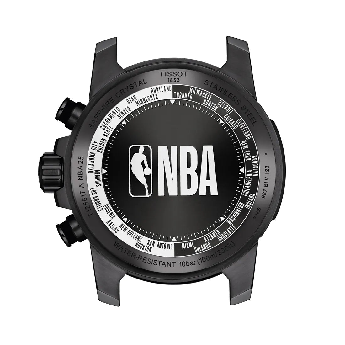 ブラックのバイマテリアル・ブレスレットがダイヤルの質感を引き立て、普段使いや運動にも最適。ケースバックには、NBAのロゴが精巧にエングレーヴィングされ、その周りをウェスタン・カンファレンスとイースタン・カンファレンスの各チームの都市と州が囲んでいます。