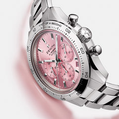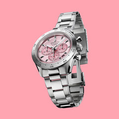 41mmのスチール製ケース、ポリッシュ仕上げスチール製ベゼル、メタリックピンクの文字盤、スチール製ブレスレットを組み合わせた「クロノマスター スポーツ ピンク」。